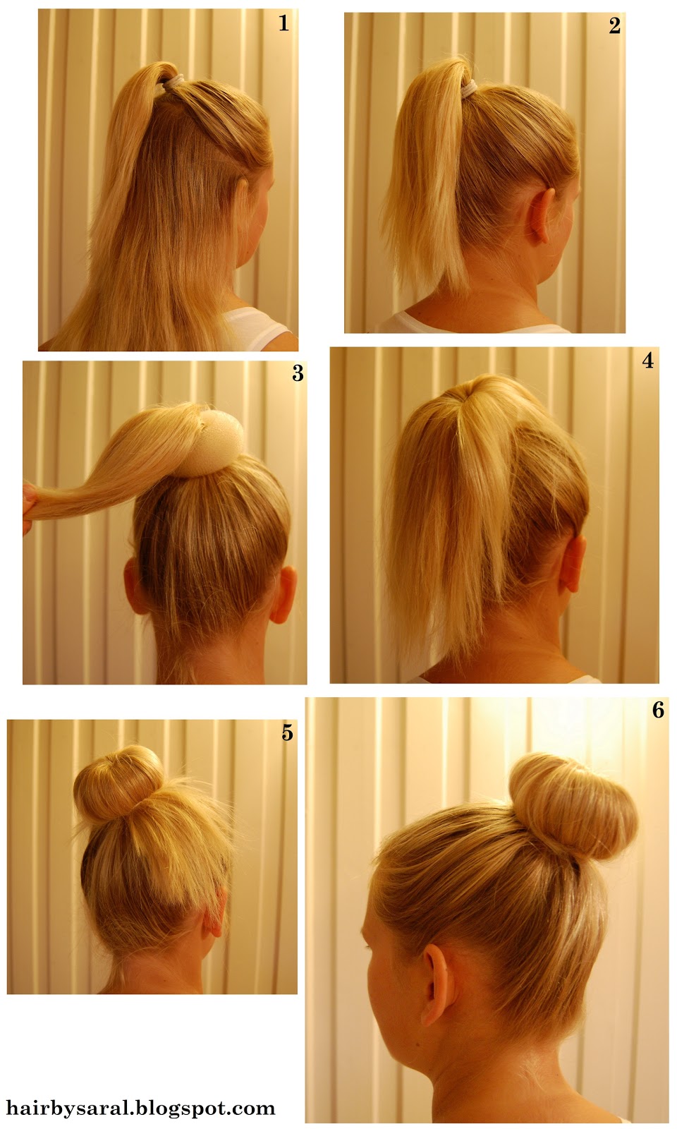 - Dela upp håret så att det täcker hela donuten, fäst en snodd över, gärna den transparenta. Håret som sticker ut fäster du med små hårnålar.